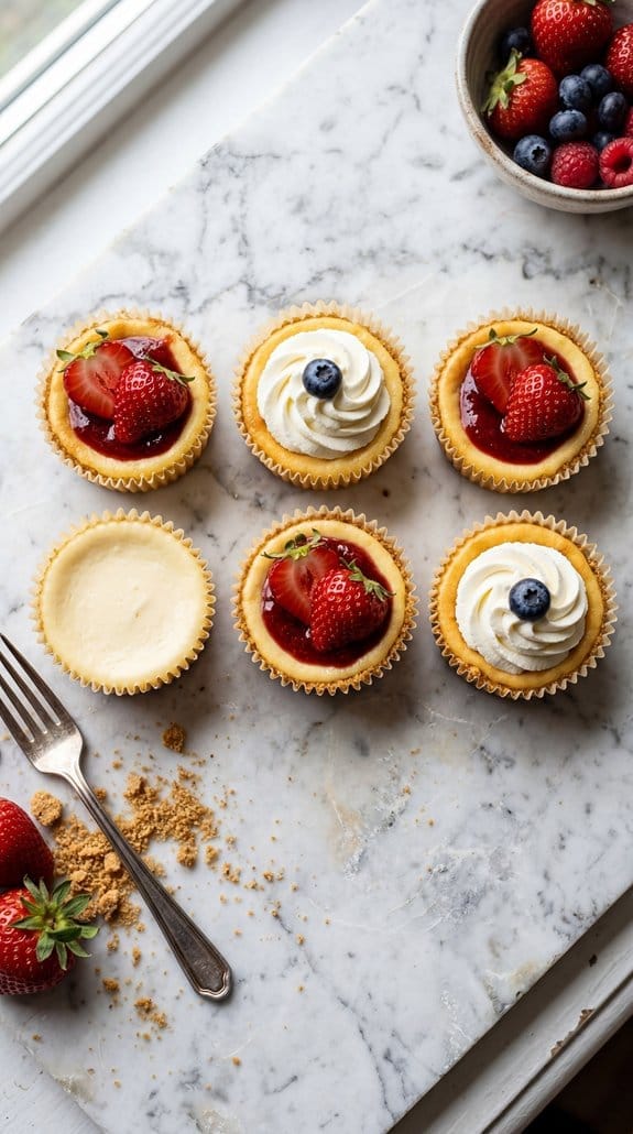 You now have everything you need to make mini cheesecakes that’ll impress at your next dinner party. Nail the crust-to-filling ratio, avoid overmixing, and chill them for at least four hours. Top each one with a specific accent—fresh raspberries, lemon curd, or a chocolate drizzle. These individual portions serve themselves, keeping presentation clean and effortless. Make them two days ahead, and you’ll enjoy the party too.